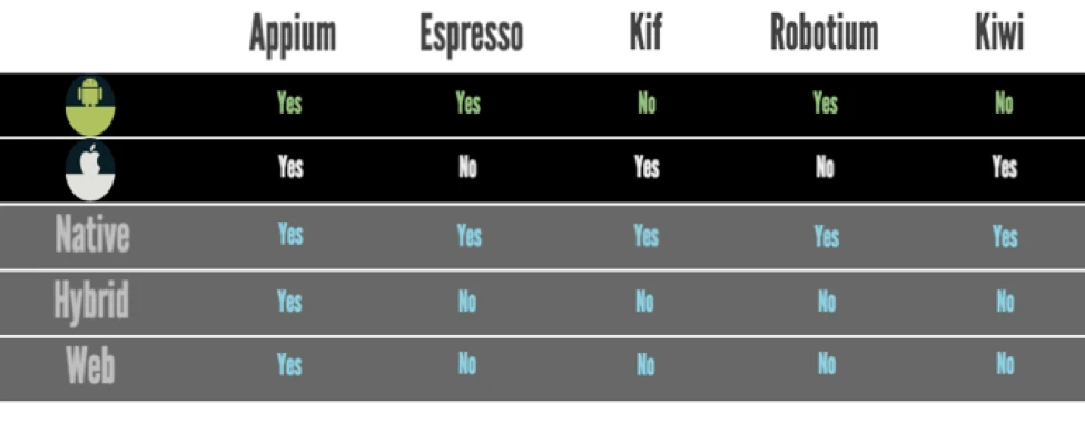 Availability of Mobile Testing Tools: Desktop and web application-based testing tools cannot be used for testing mobile applications, so a new testing framework is required. Some of the frameworks currently available for writing test scripts are: